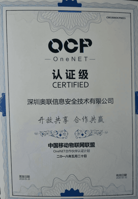 奥联获中国移动OneNET(OCP)认证级企业授牌